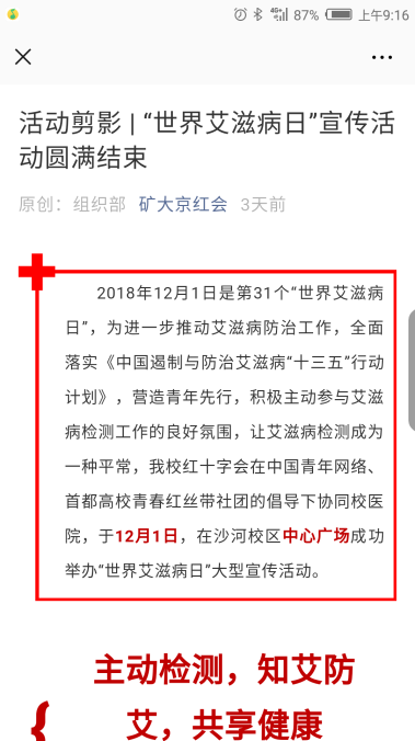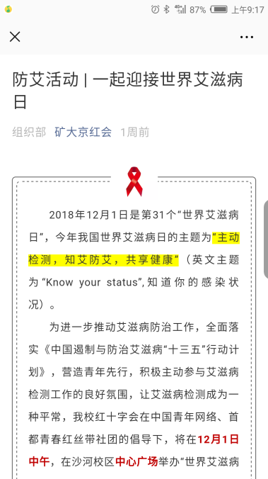 校红十字会利用官方微信公众号,也对艾滋病日活动进行了预告和宣传。