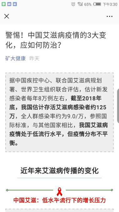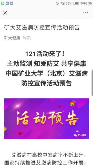 我们积极开展新媒体宣传。通过矿大校医院官方微信推送艾滋病防控知识,并进行艾滋病活动预告。
