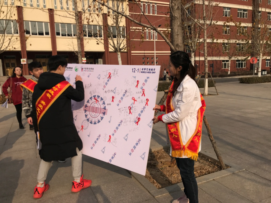 12月1日,中午11点,在沙河校区,校医院联合红十字会、青春红丝带社团,开展了大型户外宣传活动。活动包括:签名、定点拍